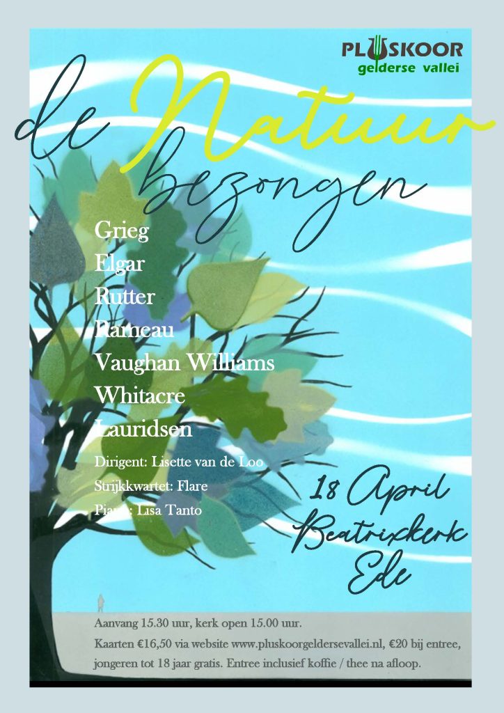 Onder leiding van Lisette van de Loo geven we dan een optreden met als titel ‘De natuur bezongen’. De pianobegeleiding wordt verzorgd door Lisa Tanto samen met het strijkersensemble Flare. Het koor zingt 8 verschillende werken, veelal over het thema ‘natuur’, afgewisseld door Lisa Tanto en het Flare Quartet.